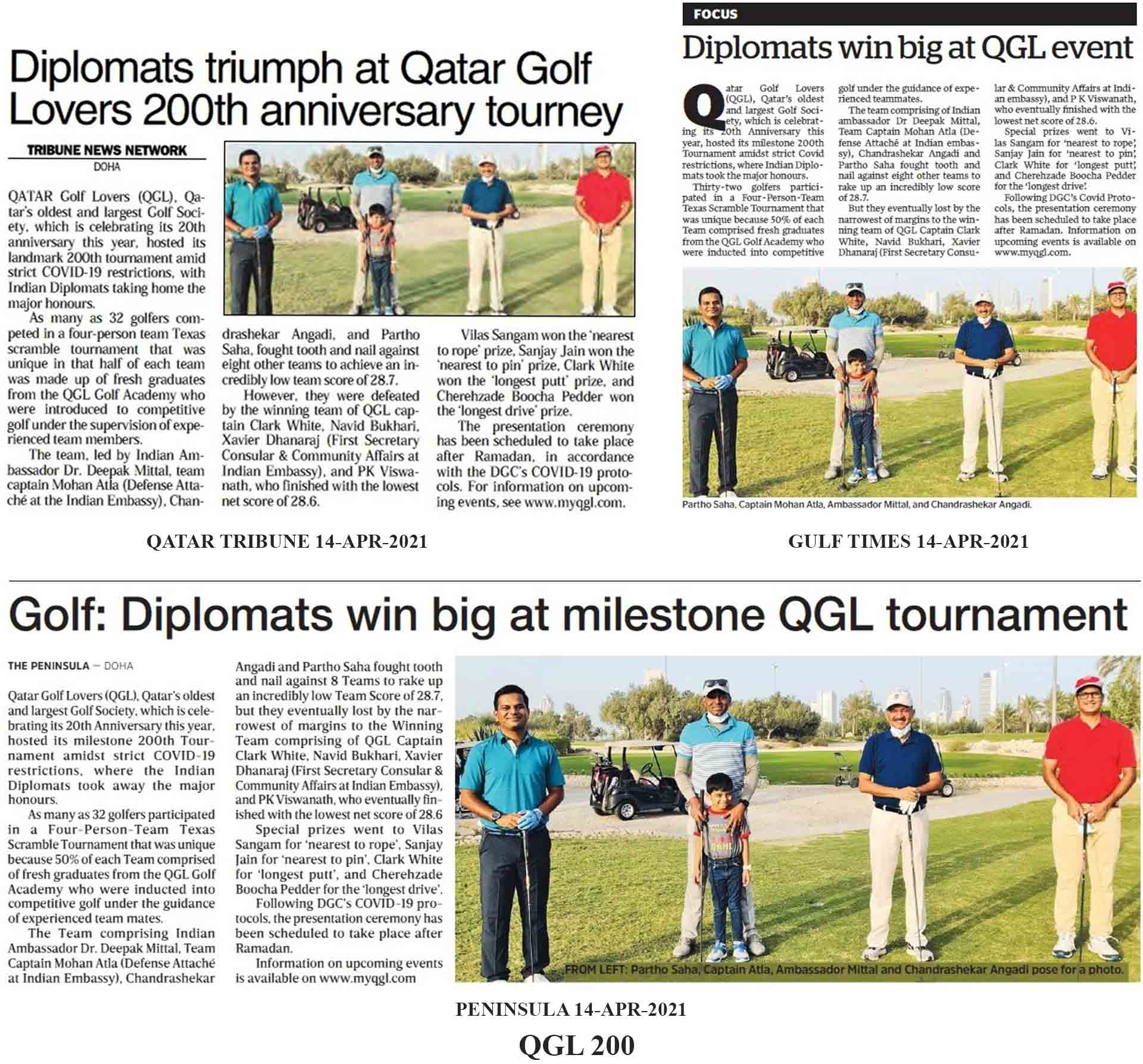 Xavier Dhanaraj and Vice President Sanjay Jain gave away the prizes to the winners at an Award Dinner Ceremony. Ambassador Pozderac appreciated the efforts of QGL for innovative golf, and congratulated all the winners. QGL, Qatar’s oldest golf society established in 2001, is planning QGL 210, details of which are available on MYQGL.COM