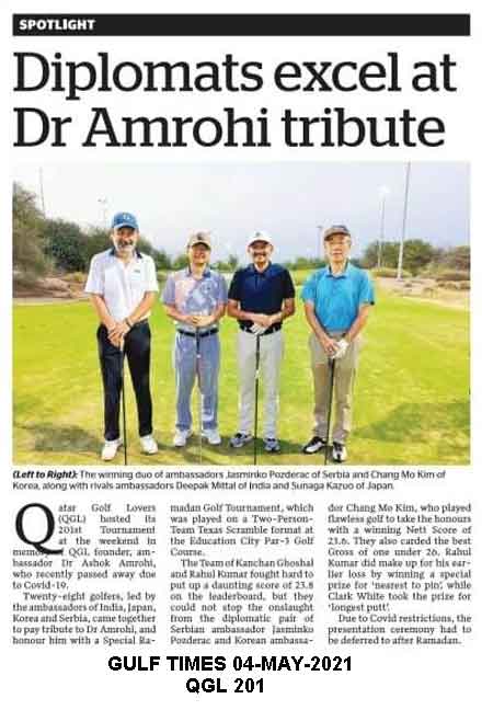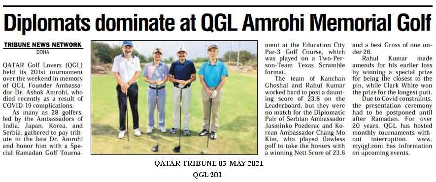 Qatar Golf Lovers (QGL) organized a special Texas Scramble Golf tournament at Doha Golf Club last week to bid farewell to Serbian Ambassador Jasminko Pozderac and his wife Ivana. Ambassador Pozderac, a big supporter of QGL and a golfer par-excellence, gave an emotional farewell speech in which he commended the efforts of QGL in promoting social golf in Qatar since 2001. Ambassador of India to Qatar Dr. Deepak Mittal and Ambassador of Kazakhstan to Qatar Arman Issagaliyev, who teamed up with Ambassador Pozderac, spoke at the Breakfast Reception after the game. Dr. Rony Paul, Karthik Ramaiah and Pavan Singh of Petro-Q Group that sponsored the event, not only presented a memento to Ambassador Pozderac, but also Prizes to the winning team of Captain Mohan Atla (Defence Attaché at the Embassy of India) and his partner Ravishankar, during breakfast and prize distribution ceremony. Master of Ceremonies Chandrashekar Angadi took charge of the event in presence of QGL President Manoj Megchiani and Vice President Sanjay Jain. QGL will resume its monthly tournaments after the summer break in September with its 211th Tournament. Golf enthusiasts can visit MYQGL.COM for news and updates on future events.