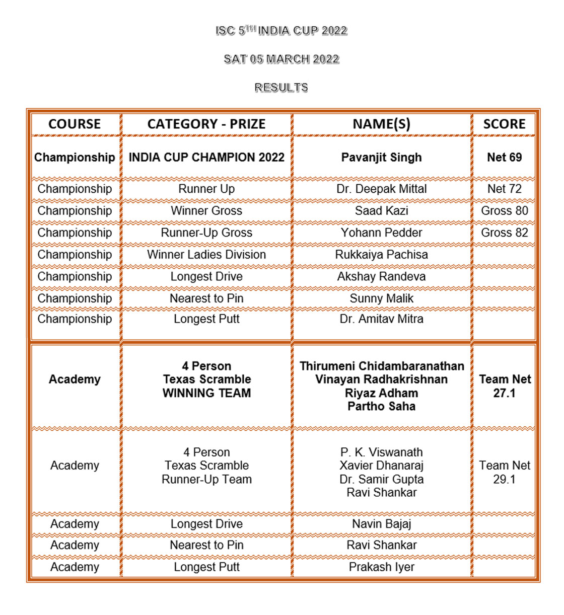 In the Academy Course Texas Scramble Format, a tight finish saw ‘Team Vilas Sangam & Manna Dey’ TIE for the Runners-up spot with ‘Team Ashish Jain & Samir Gupta’, while ‘Team Mohd Azfar Ali & Syed Ali Ahmed’ were declared Champions. Special prizes in this Format went to Samir Gupta for ‘Longest Drive’, and Kunal Bhatia for ‘Nearest to Pin’ as well as ‘Closest to Rope’.